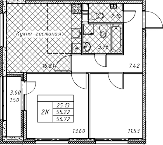 Двухкомнатная квартира на 7-ом этаже 56,72 кв.м
