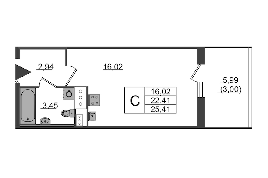 Квартира-студия на 12-ом этаже 25,41 кв.м