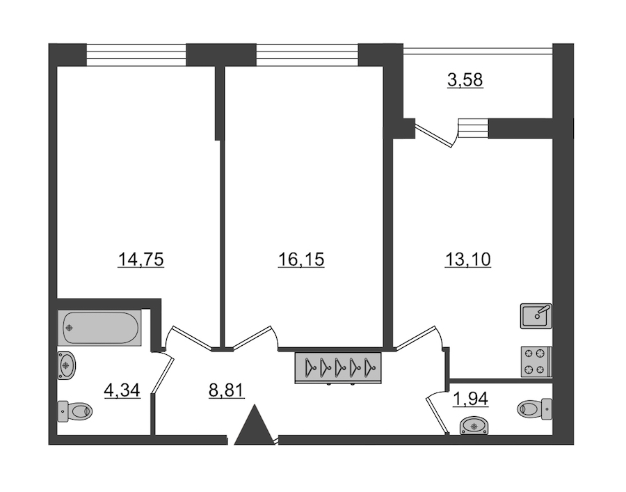 Двухкомнатная квартира на 1-ом этаже 60,88 кв.м