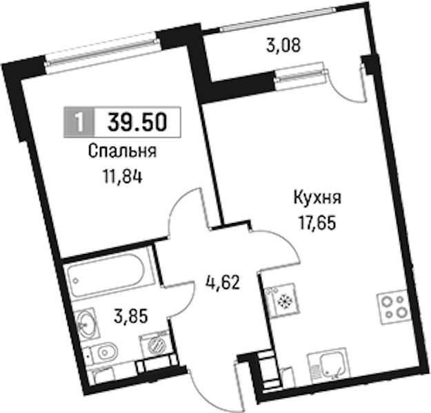 Однокомнатная квартира на 6-ом этаже 39,5 кв.м