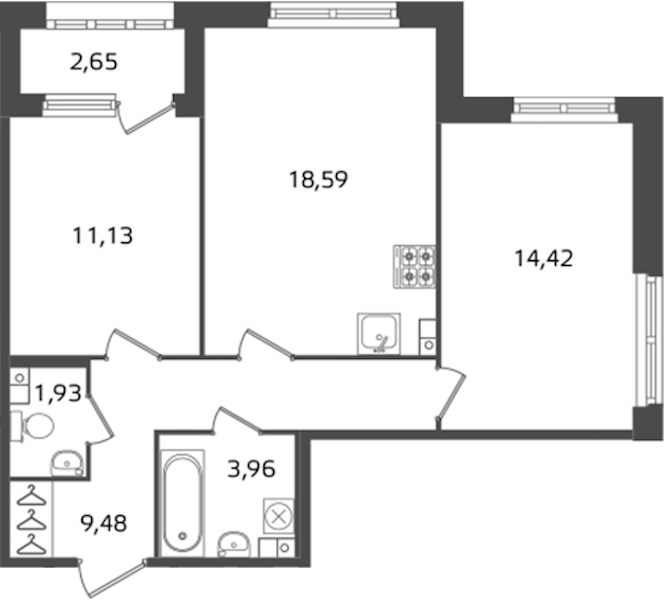 Двухкомнатная квартира на 3-ем этаже 59,51 кв.м