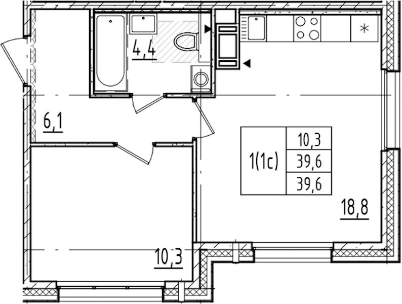 Однокомнатная квартира на 4-ом этаже 39,6 кв.м
