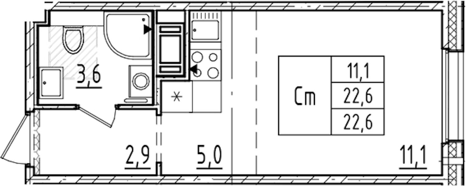 Квартира-студия на 9-ом этаже 22,6 кв.м
