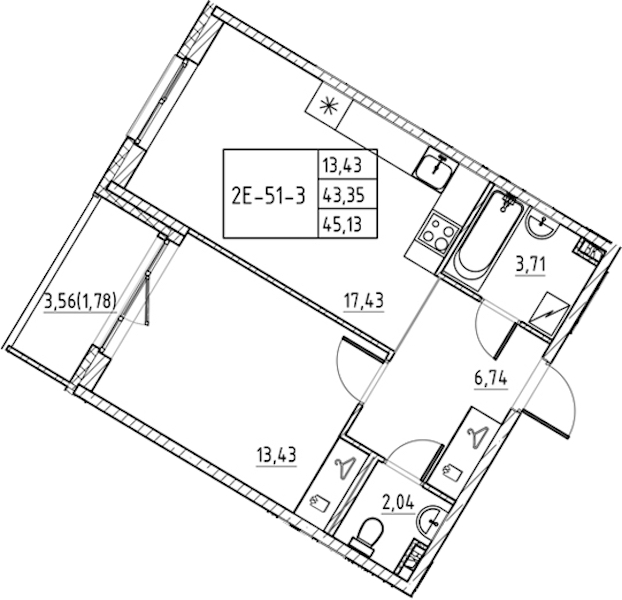 - Площадь45,13 м2