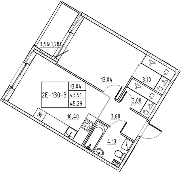 Однокомнатная квартира на 5-ом этаже 45,29 кв.м
