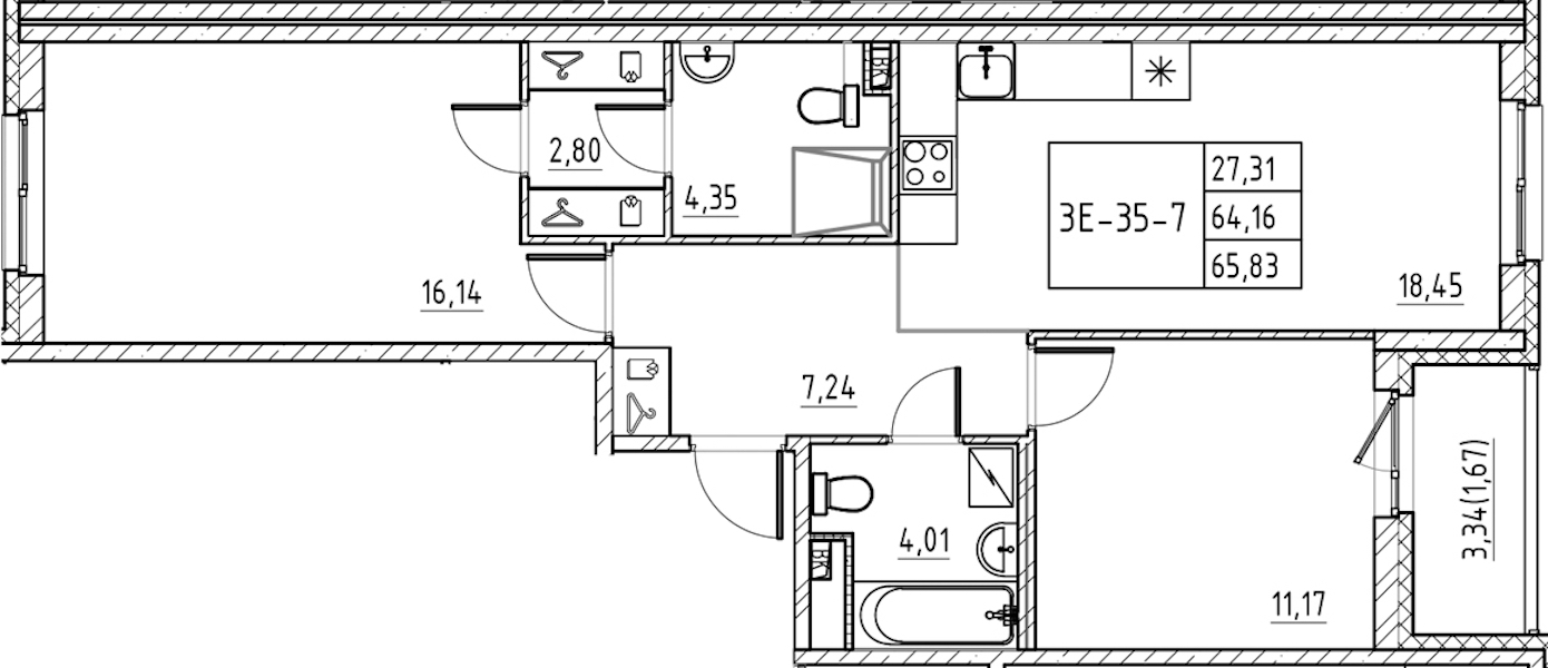 Двухкомнатная квартира на 2-ом этаже 65,83 кв.м