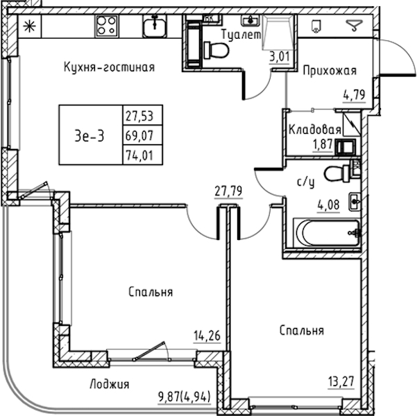 Двухкомнатная квартира на 4-ом этаже 74,01 кв.м