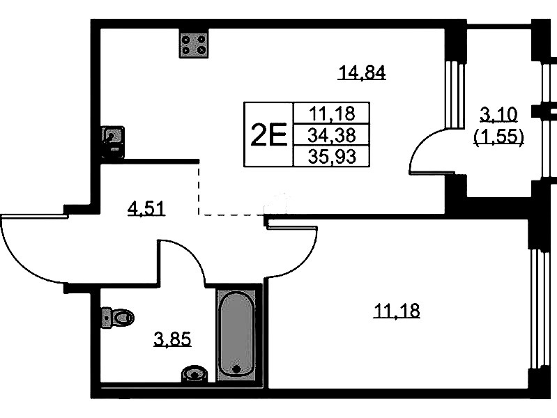 Однокомнатная квартира на 15-ом этаже 35,93 кв.м