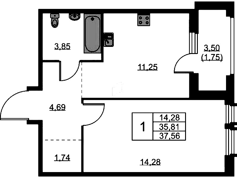 Однокомнатная квартира на 14-ом этаже 37,56 кв.м