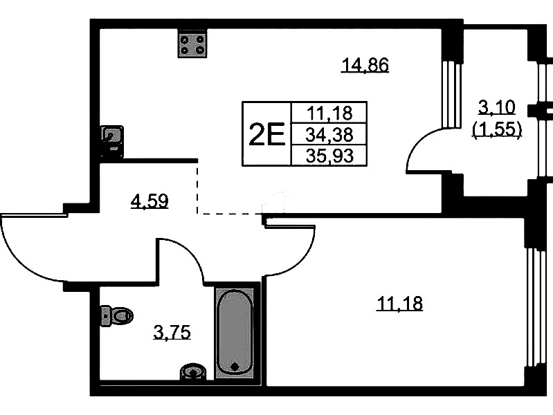 Однокомнатная квартира на 15-ом этаже 35,93 кв.м