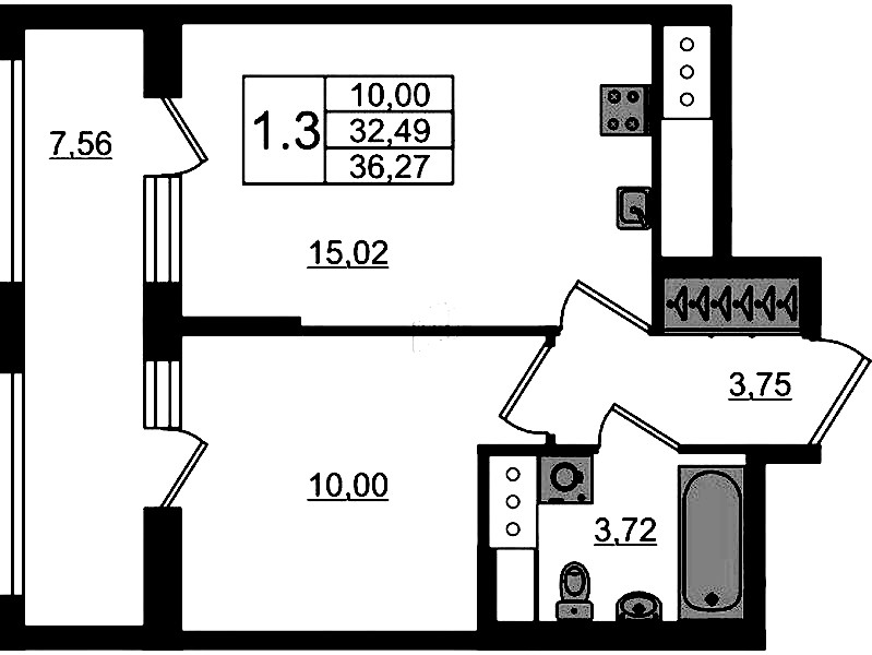 Однокомнатная квартира на 3-ем этаже 32,49 кв.м