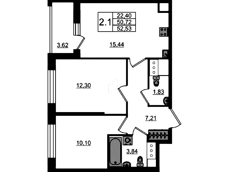 Двухкомнатная квартира на 8-ом этаже 50,72 кв.м