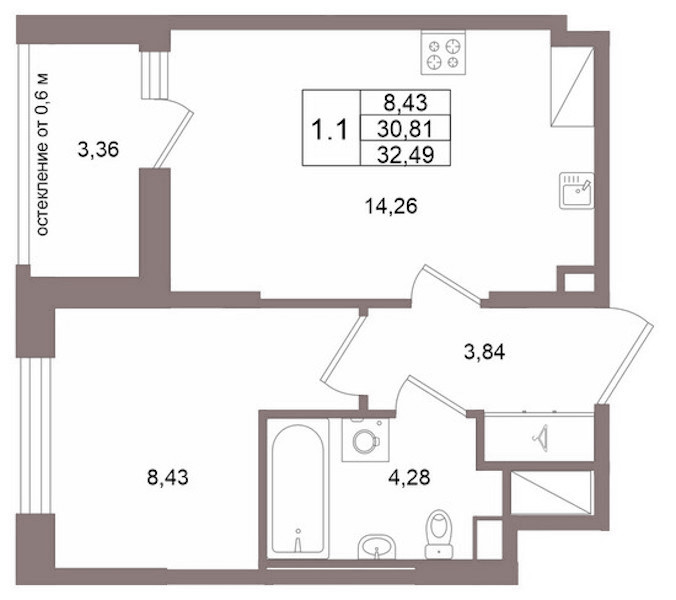 Однокомнатная квартира на 7-ом этаже 30,81 кв.м