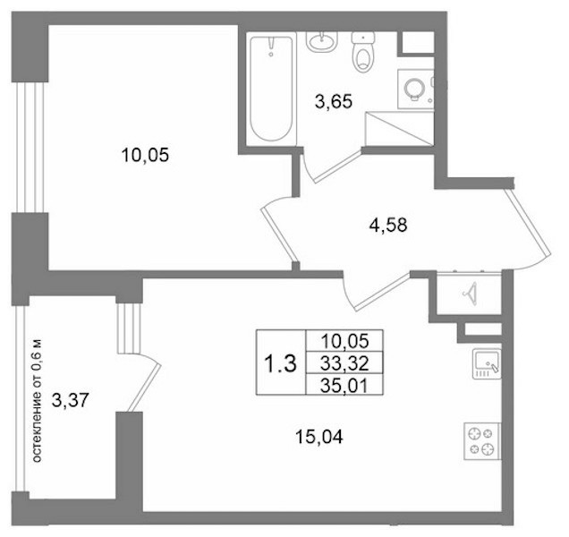 Однокомнатная квартира на 3-ем этаже 33,32 кв.м