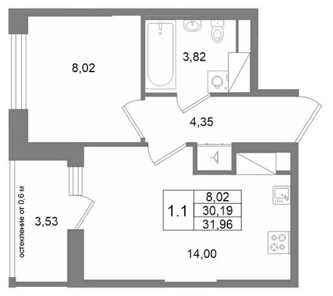 Однокомнатная квартира на 6-ом этаже 30,19 кв.м