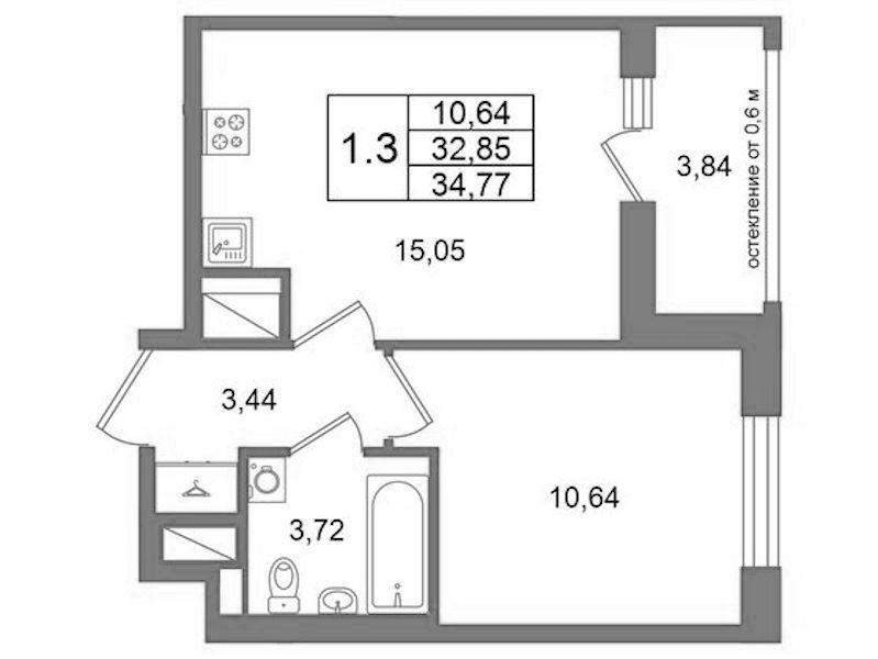 Однокомнатная квартира на 8-ом этаже 32,85 кв.м