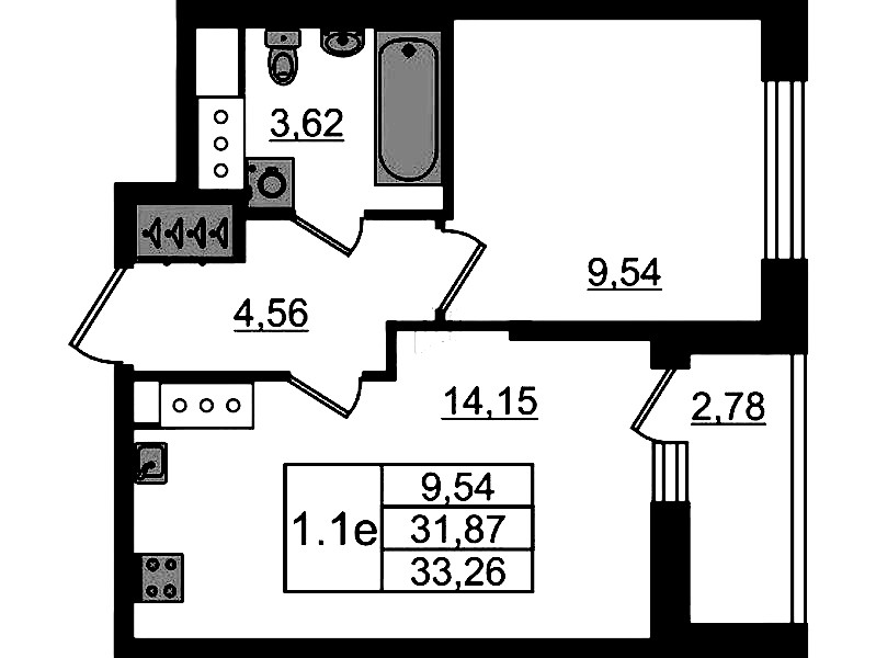 Однокомнатная квартира на 14-ом этаже 31,87 кв.м