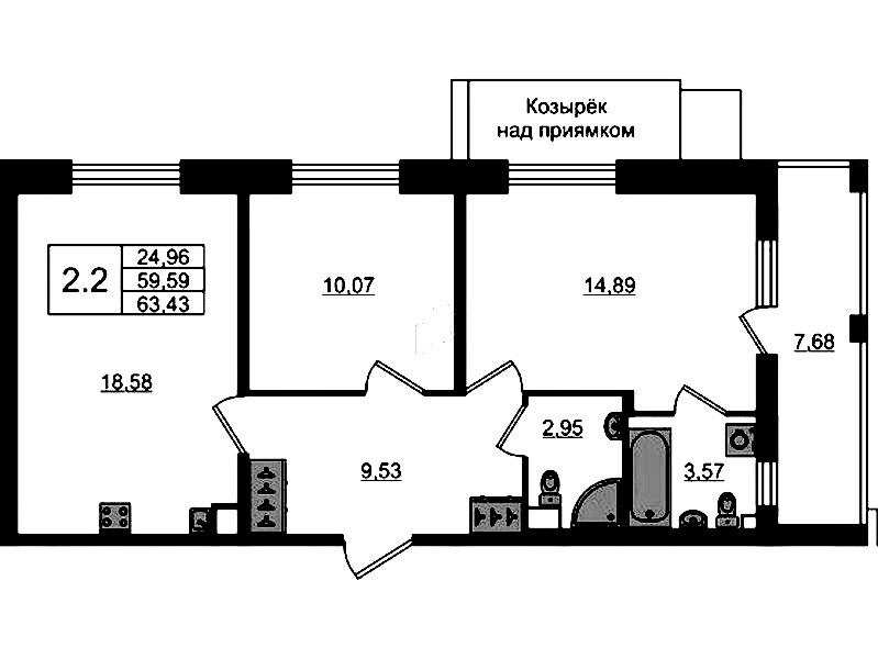 Двухкомнатная квартира на 1-ом этаже 59,59 кв.м