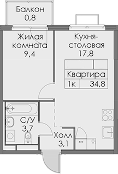 Однокомнатная квартира на 5-ом этаже 34,8 кв.м