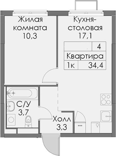 • Площадь34,4 м2