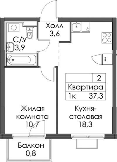 Однокомнатная квартира на 8-ом этаже 37,3 кв.м