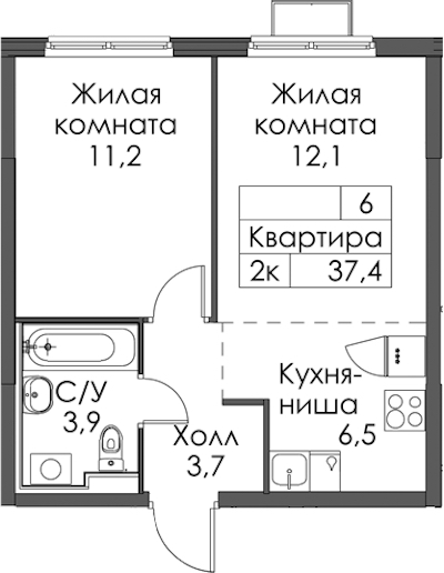 - Площадь37,4 м2