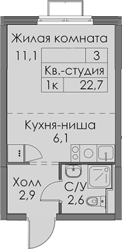 Квартира-студия на 8-ом этаже 22,7 кв.м