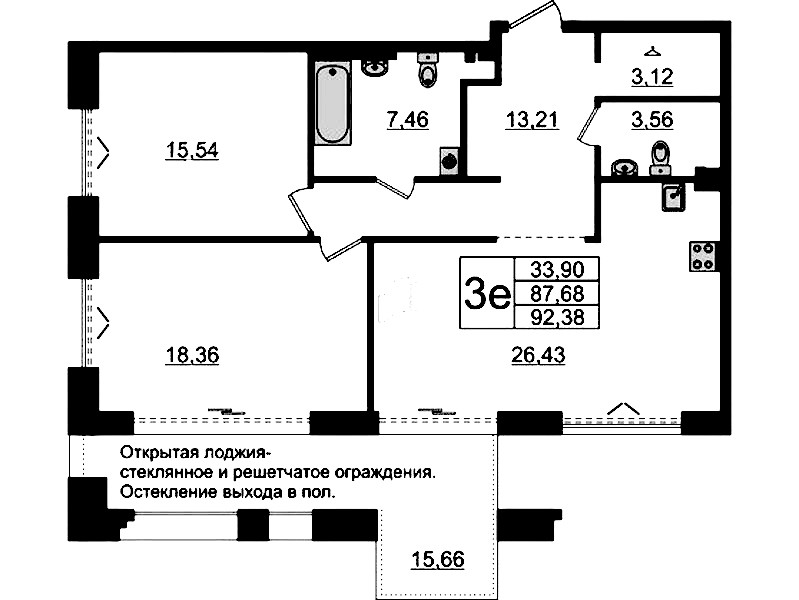 Двухкомнатная квартира на 3-ем этаже 87,68 кв.м