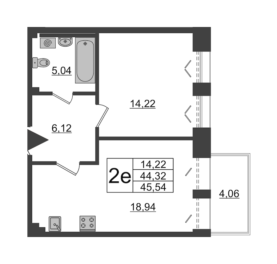 Однокомнатная квартира на 3-ем этаже 44,32 кв.м