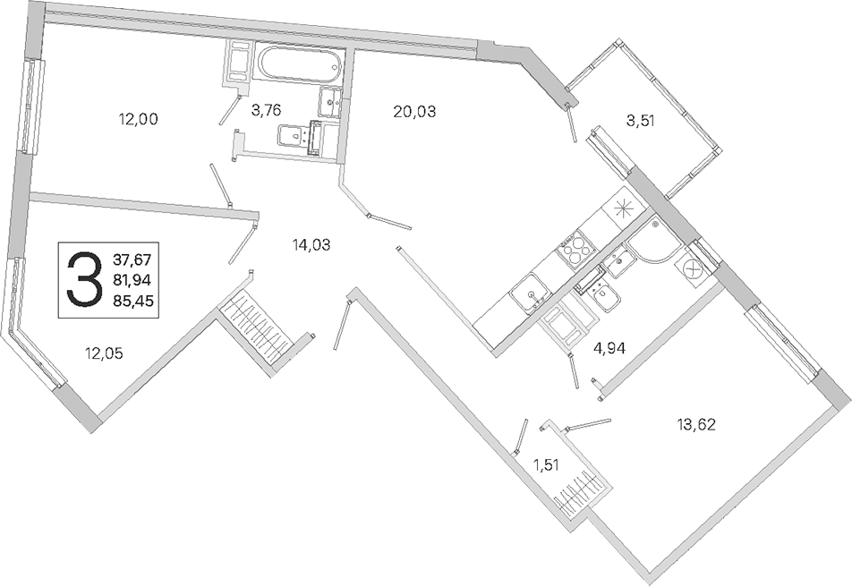 Трёхкомнатная квартира на 5-ом этаже 81,94 кв.м