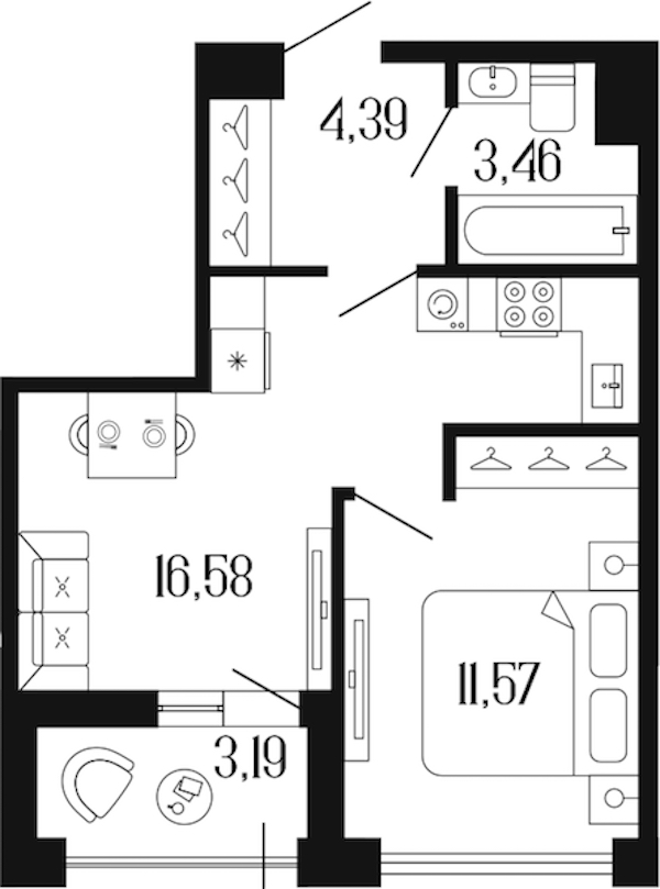 - Площадь кухни16,58 м2