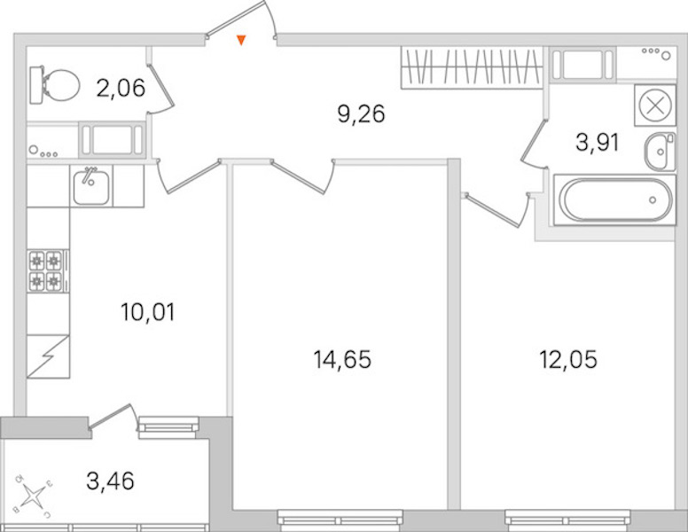 Двухкомнатная квартира на 6-ом этаже 51,94 кв.м