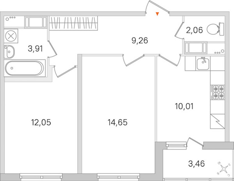 Двухкомнатная квартира на 8-ом этаже 51,94 кв.м