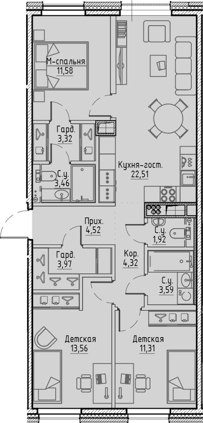 Трёхкомнатная квартира на 7-ом этаже 84,06 кв.м