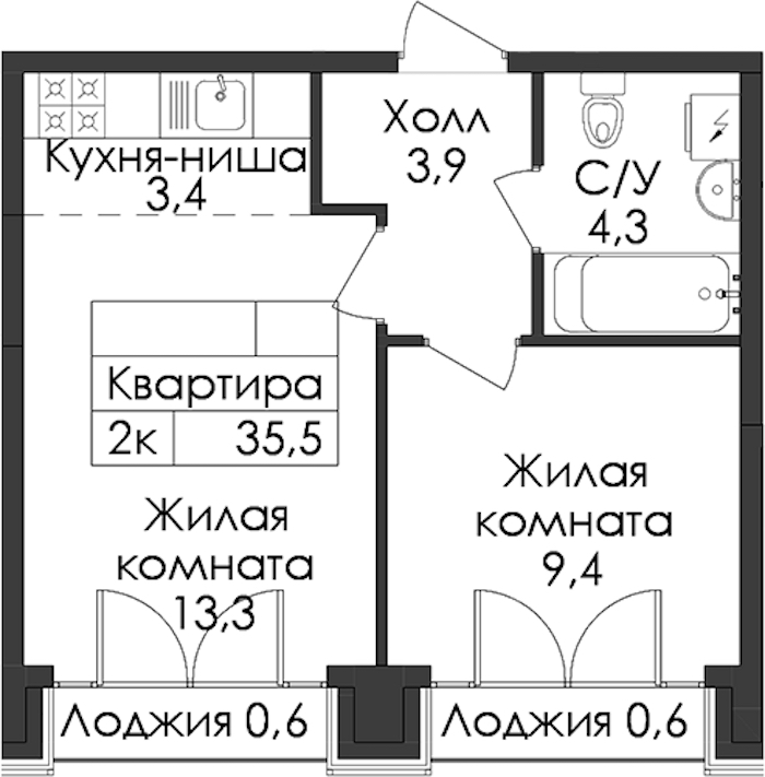 Однокомнатная квартира на 8-ом этаже 35,5 кв.м