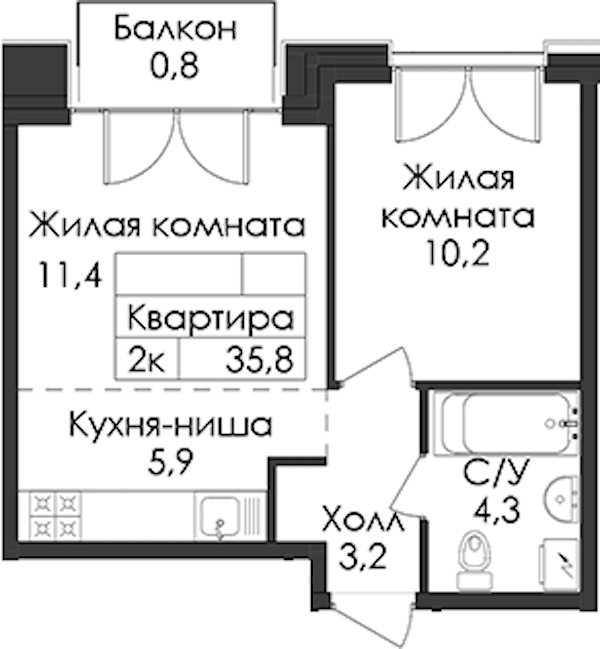 • Площадь35,8 м2