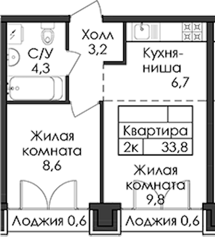 Однокомнатная квартира на 9-ом этаже 33,8 кв.м
