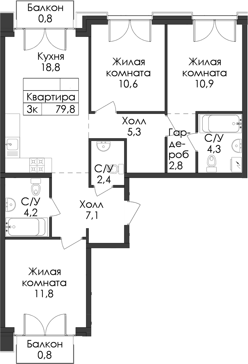 Трёхкомнатная квартира на 6-ом этаже 79,8 кв.м