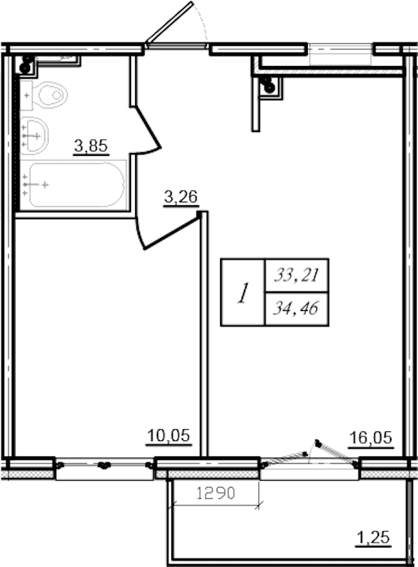 Однокомнатная квартира на 6-ом этаже 34,46 кв.м