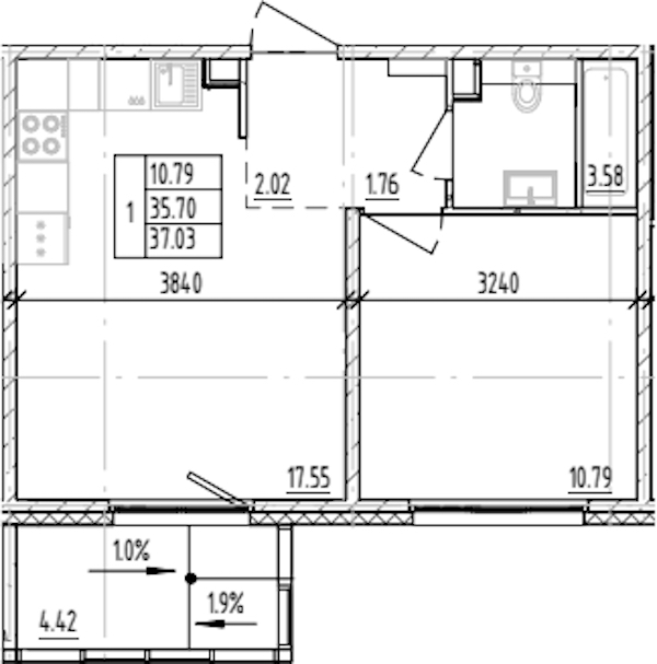 Однокомнатная квартира на 8-ом этаже 37,03 кв.м