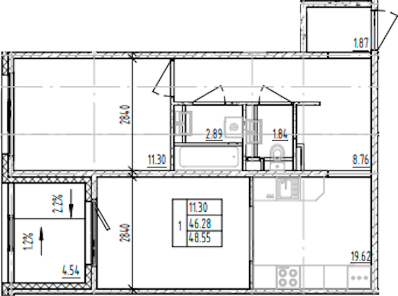 Однокомнатная квартира на 10-ом этаже 48,55 кв.м