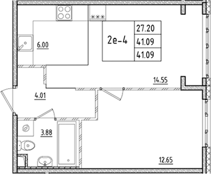 Однокомнатная квартира на 1-ом этаже 41,09 кв.м