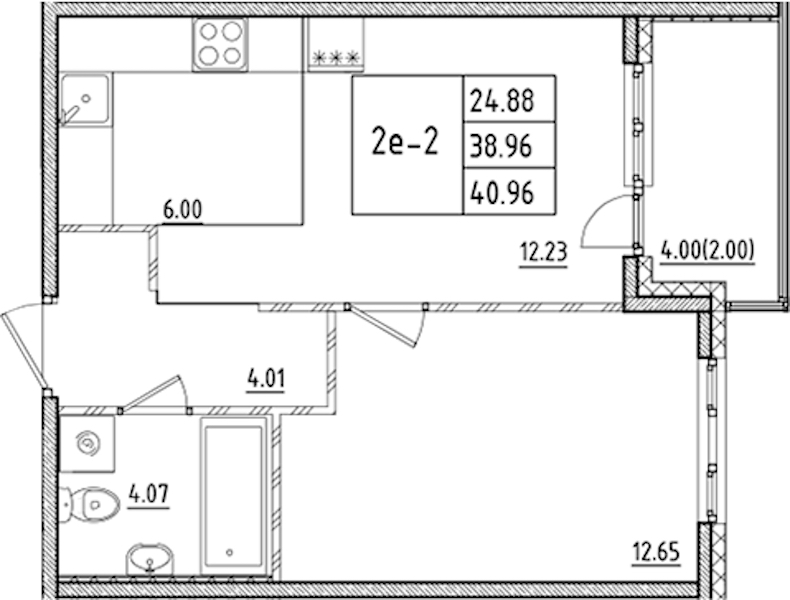 Однокомнатная квартира на 2-ом этаже 40,96 кв.м