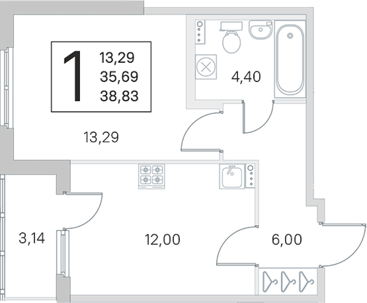 Однокомнатная квартира на 1-ом этаже 35,69 кв.м