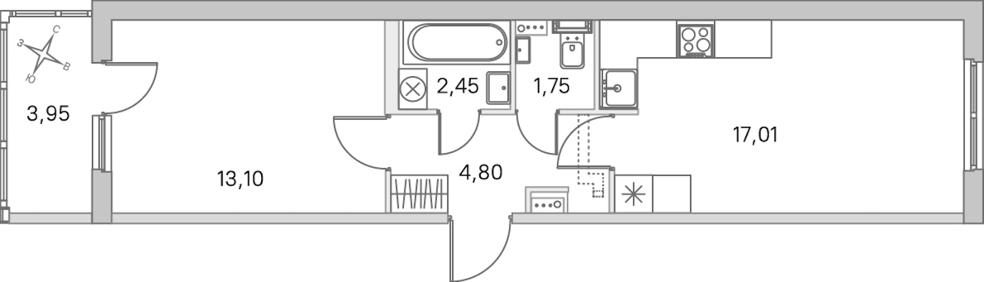 Однокомнатная квартира на 1-ом этаже 39,11 кв.м