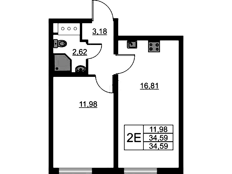 Однокомнатная квартира на 23-ем этаже 34,59 кв.м