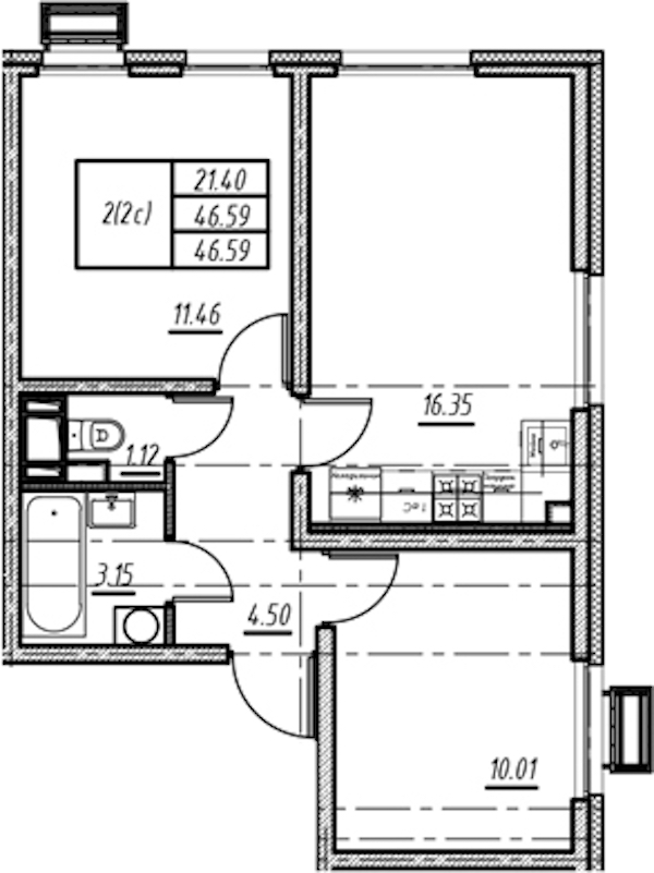 Двухкомнатная квартира на 3-ем этаже 46,6 кв.м
