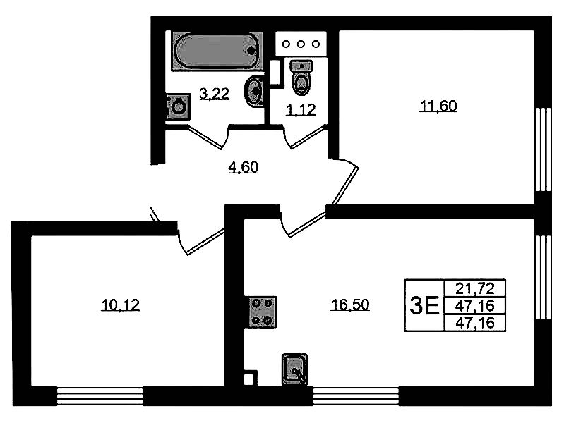 Двухкомнатная квартира на 19-ом этаже 47,16 кв.м