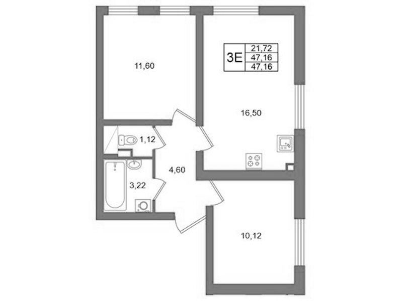 Двухкомнатная квартира на 15-ом этаже 47,16 кв.м
