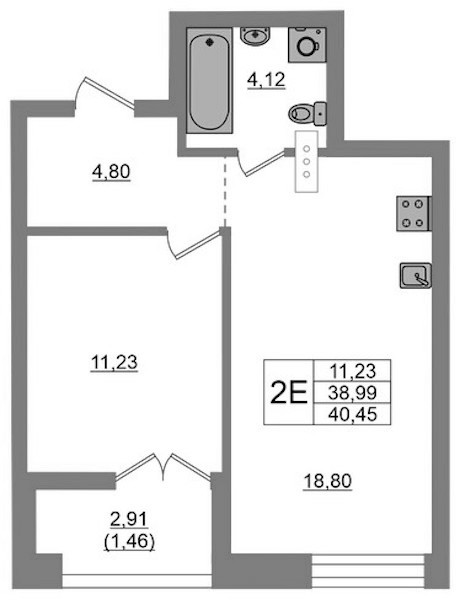 Однокомнатная квартира на 7-ом этаже 40,45 кв.м